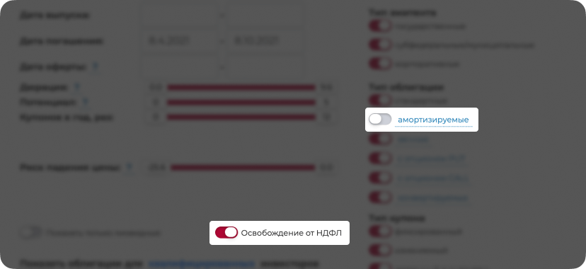 Если вы не хотите думать об амортизации или налогах, такие бумаги можно отключить в расширенных фильтрах «Дохода» — кнопками «Освобождение от НДФЛ» и «амортизируемые»: