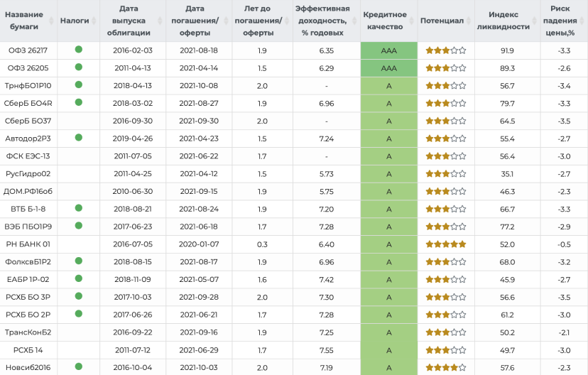 В таблице ниже можно посмотреть, какие облигации нам предложит сервис: