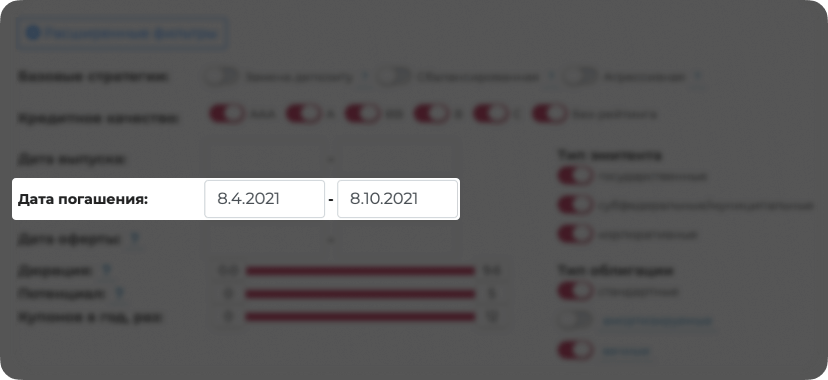 Заходим в расширенные фильтры и выбираем дату погашения: через 1,5—2 года от сегодняшней даты.