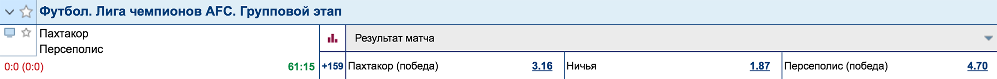 В линии на этот матч коэффициент на победу «Пахтакора» — 3,16 на победу «Персеполиса» — 4,7, а на ничью — 1,87. Если мы поставим 100 рублей на победу «Пахтакора», и он победит, то получим на руки 100 × 3,16 = 316 Р. Из них 100 рублей — наша ставка, поэтому реальный плюс — 216 Р. Если мы не угадали результат, ставка уходит букмекеру