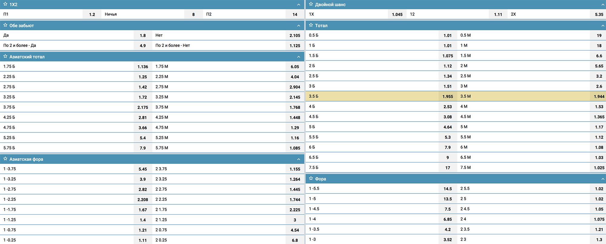 У этого букмекера очень широкая линия — на скрине малая часть росписи на матч