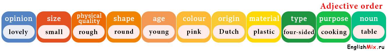 В приведенной ниже таблице будет представлен необходимый порядок прилагательных в английском языке при описании предмета.