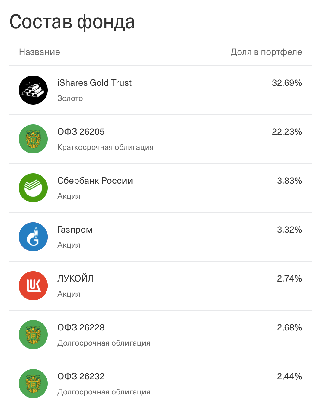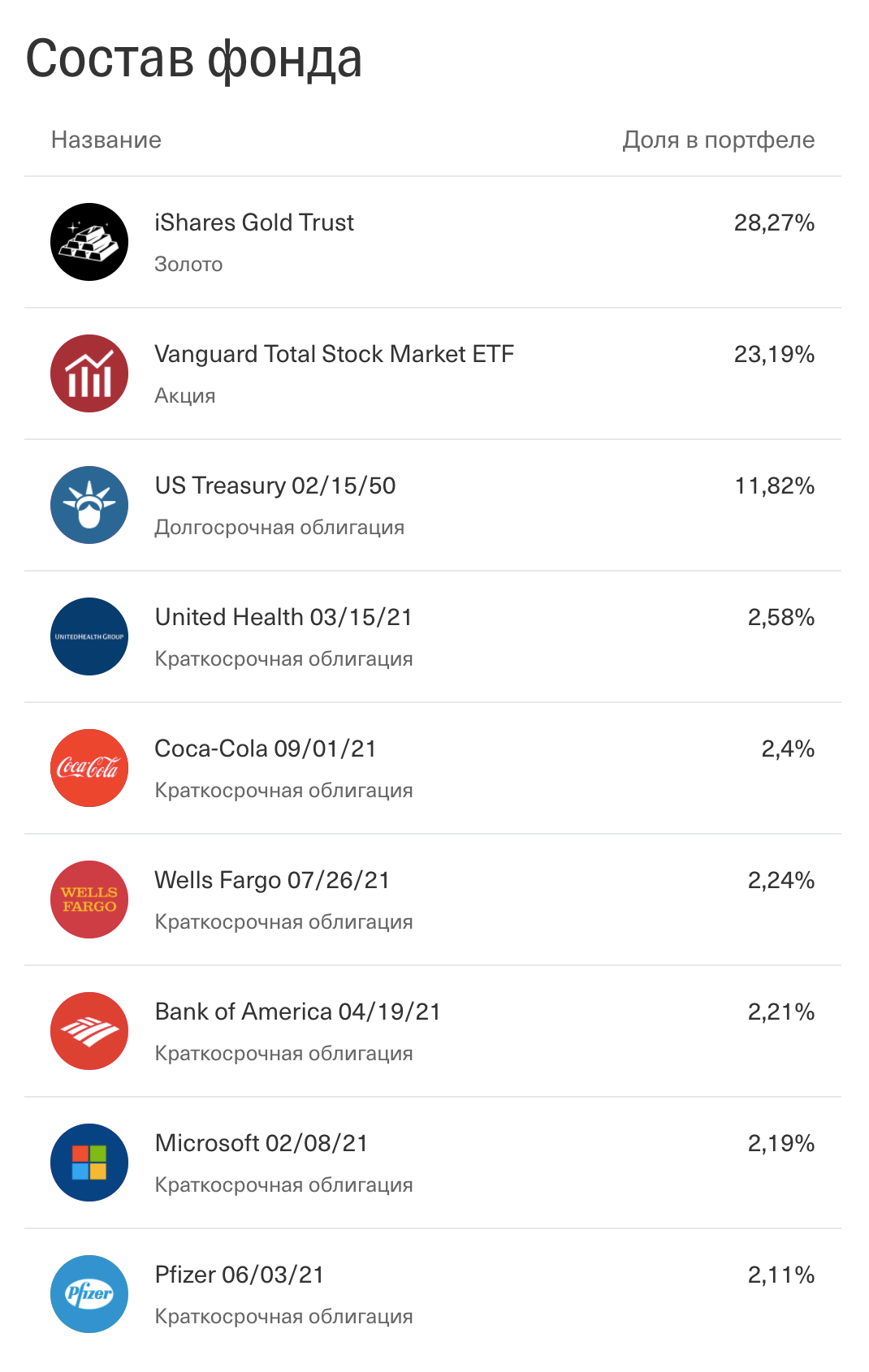 | Тикер | Название фонда | Доля |