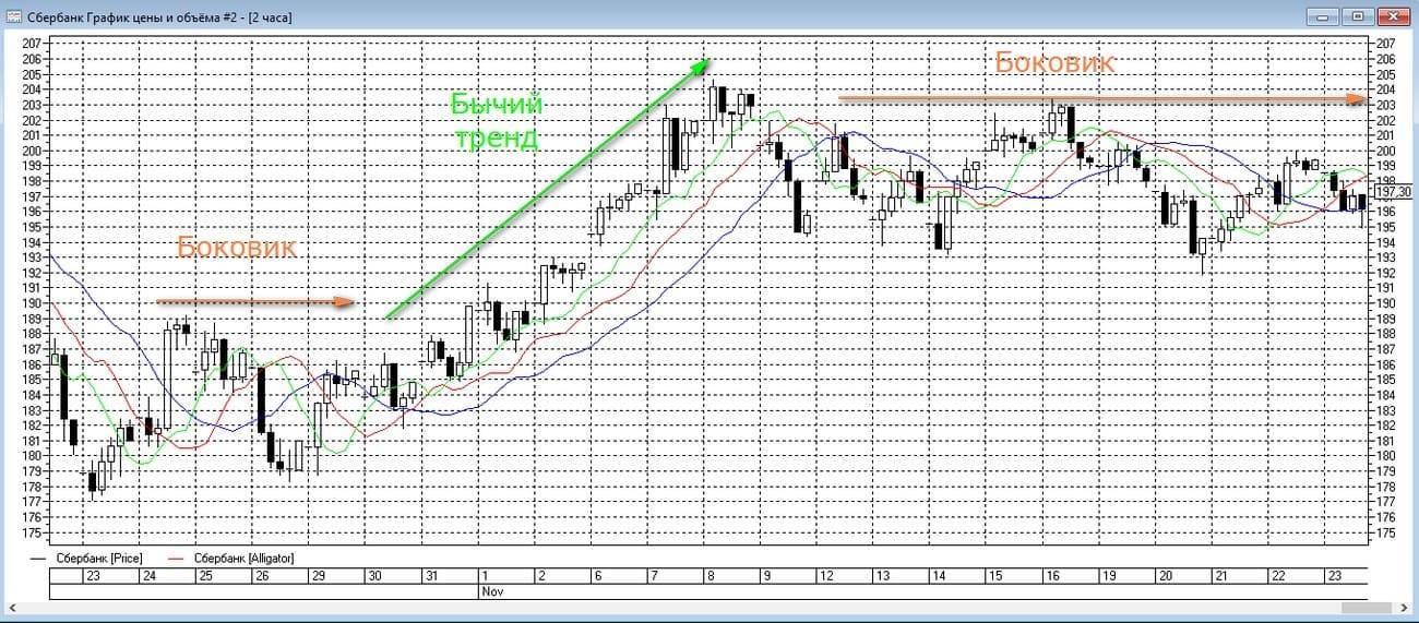 В основу этого инструмента, созданного трейдером Биллом Вильямсом, положены 3 скользящие средние. Однако методология определения ценовой тенденции отлична. Когда индикаторные кривые движутся параллельно и направлены в одну сторону, на рынке царит тренд, идущий в том же направлении. Давайте в качестве примера рассмотрим участок графика обыкновенных акций Сбербанка.