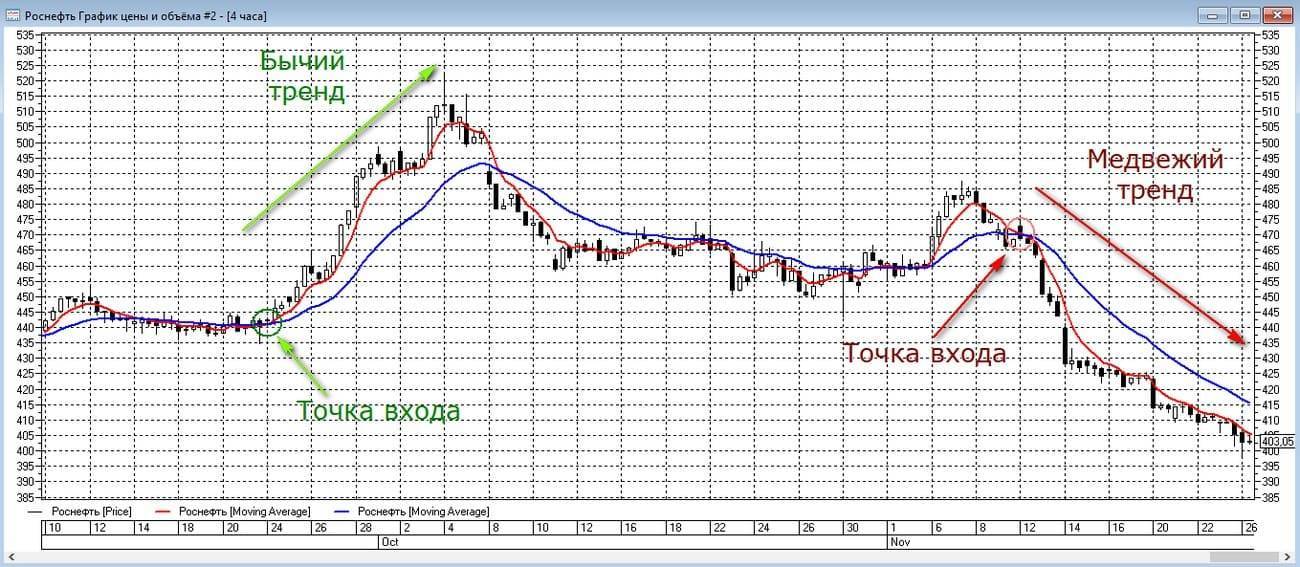 Обратите внимание на отрезок графика котировок Роснефти. В тот момент, когда красная скользящая средняя снизу вверх пересекает синюю – это начало бычьего тренда