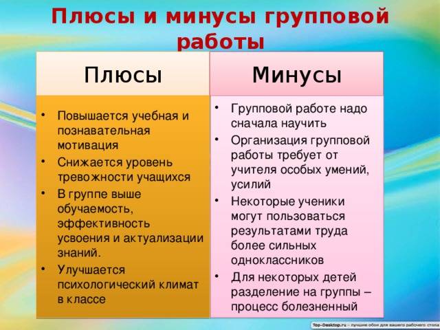 Схема работы здесь проста: учитель объясняет материал и закрепляет его заданиями для пар/групп, изредка персонально работая с каждым учеником. С детства привыкнув к такому подходу к науке, уже взрослый человек подсознательно выбирает этот метод изучения английского и идет записываться на групповой курс. Однако, такая технология обучения имеет свои подводные камни и подходит не всем. Плюсы и минусы распишем в таблице ниже.