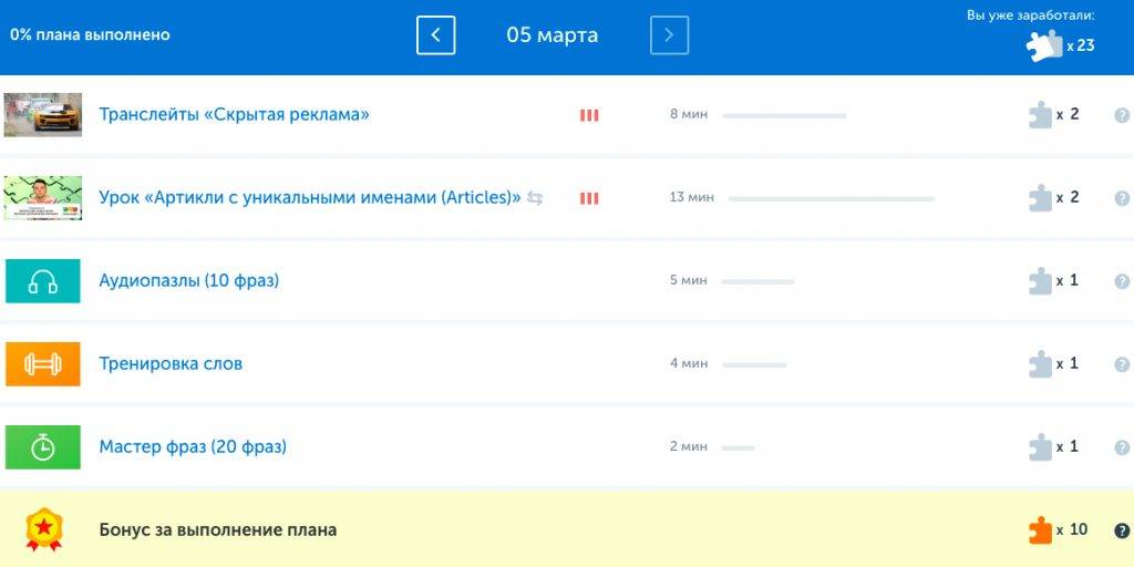 Я решила заниматься по личному плану. По сути это конструктор, который можно полностью настроить под себя. Указываете текущий уровень владения языком, отмечаете навыки, которые хотите подтянуть, и выбираете продолжительность занятий — от 20 до 120 минут в день. Количество уроков тоже можно выбрать самостоятельно — хоть каждый день, хоть два раза в неделю.