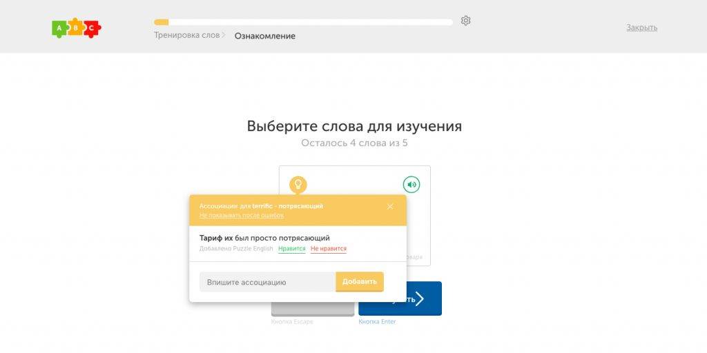 Изучать слова Puzzle English предлагает с помощью ассоциаций. Например, terrific — «потрясающий» звучит похоже на «тариф».