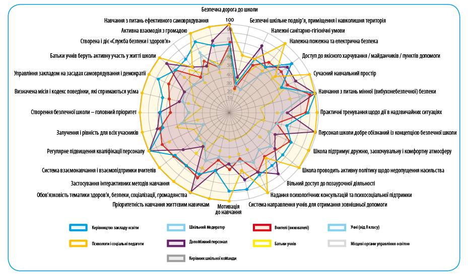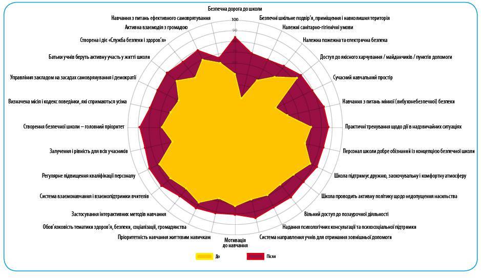 Приклад табличної візуалізації результатів експрес-оцінювання на рівні критеріїв. Рівень безпеки і благополуччя закладу освіти вимірюється у балах від 0 до 100. Що вище бал, то ближче відповідний показник до еталонного.