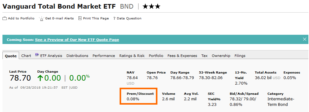 Арбитражный механизм, осуществляемый путем операции создания и погашения паев внутри дня, позволяет поддерживать цену пая максимально близко к набору составляющих его ценных бумаг. Эту разницу между ценой составляющих пая и самого пая можно увидеть на ресурсе morningsstar: