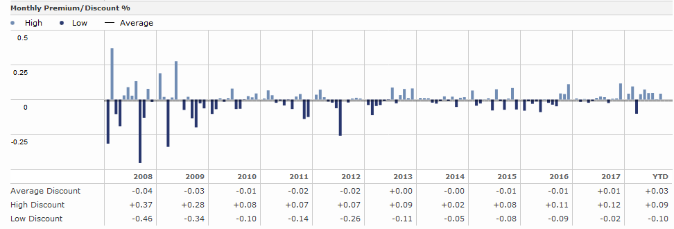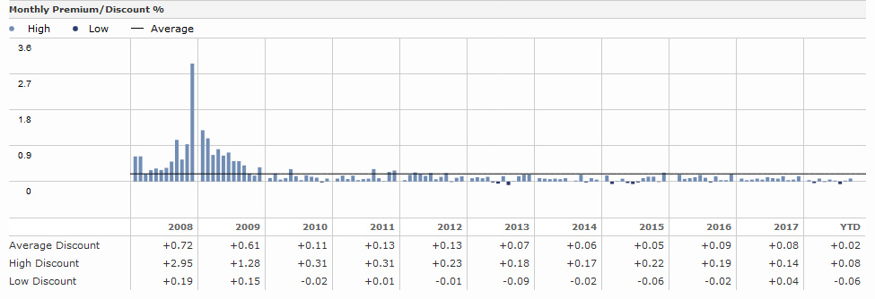 Положительная величина означает, что фонд торгуется с премией, т.е. стоит чуть выше, чем сумма входящих в него ценных бумаг. Отрицательное значение значит, что фонд торгуется дешевле — сильные разрывы могут возникать в случае рыночного «шторма», но в обычном случае разница составляет не более нескольких сотых процента: