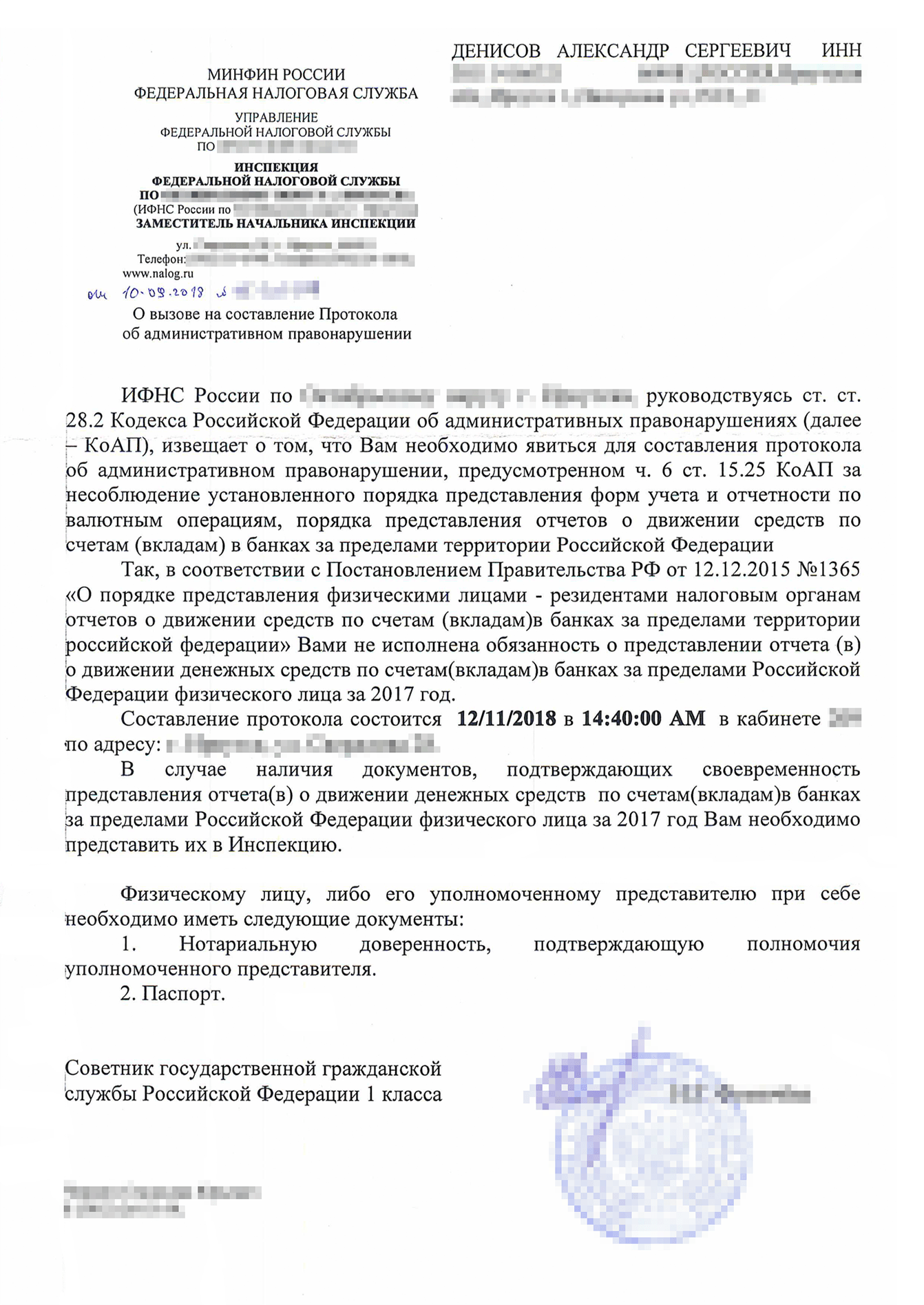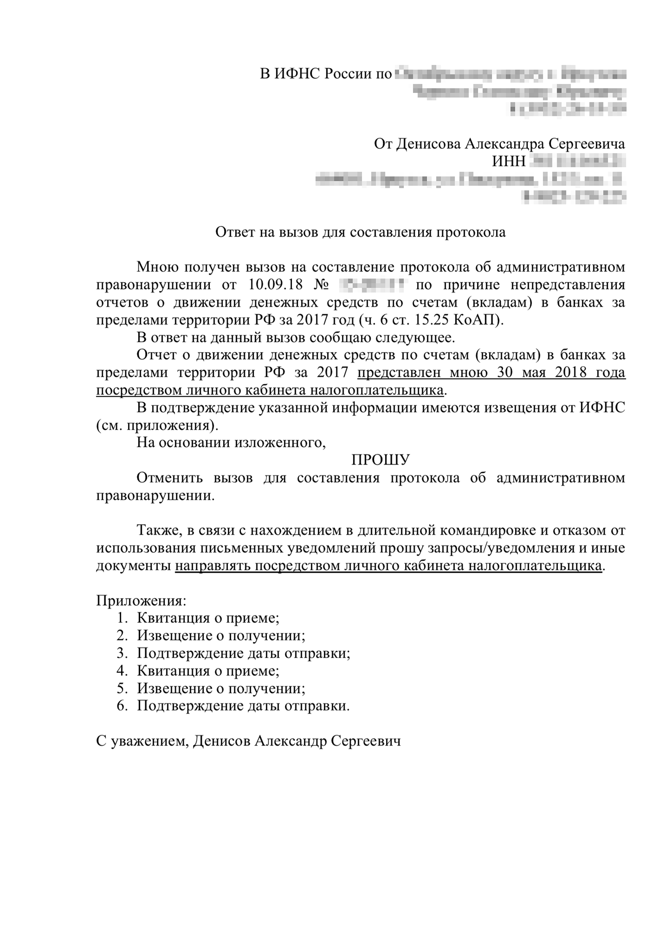 Через месяц после подачи декларации супругу вызвали в ФНС по месту регистрации для дачи письменных пояснений. Налоговая хотела узнать о цели открытия счета и составить протокол об административном правонарушении за просрочку сдачи отчета.