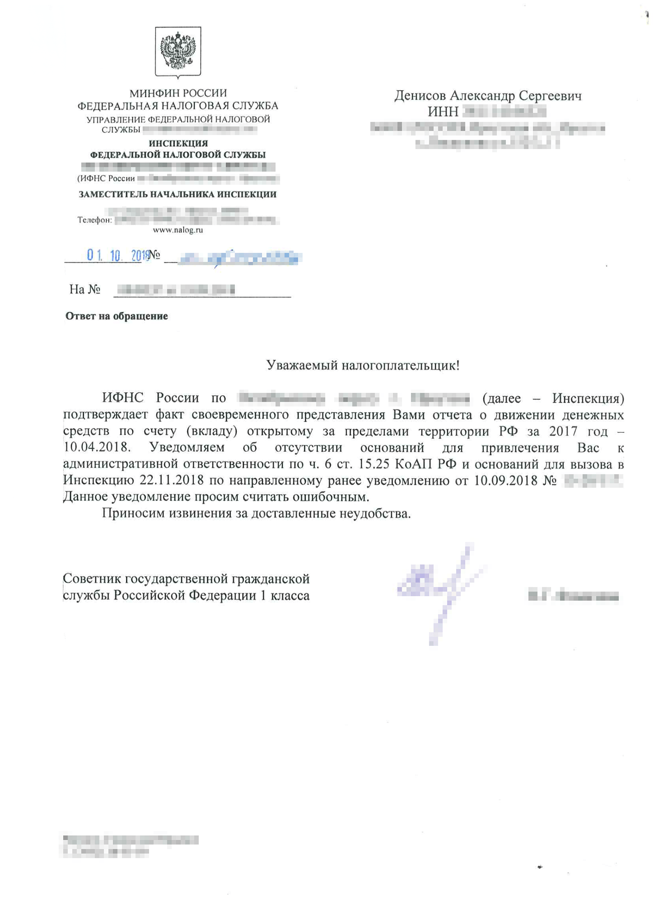 30 мая 2018 года мы подали специальные декларации в одну из московских ИФНС. Весь процесс занял 10 минут. Вечером того же дня через личный кабинет налогоплательщика мы подали отчеты о движении денежных средств: я за 2017 год, супруга — за 2016 и 2017. С отчетом супруге повезло: в общем случае отчеты не попадают под амнистию, но в отдельных случаях все решают ответственные люди. Мне удалось убедить налогового инспектора, что отчет за 2016 год достоин амнистии, и супругу не наказали за просрочку. Но если бы мы опоздали с отчетом за 2017, то, скорее всего, пришлось бы заплатить штраф.