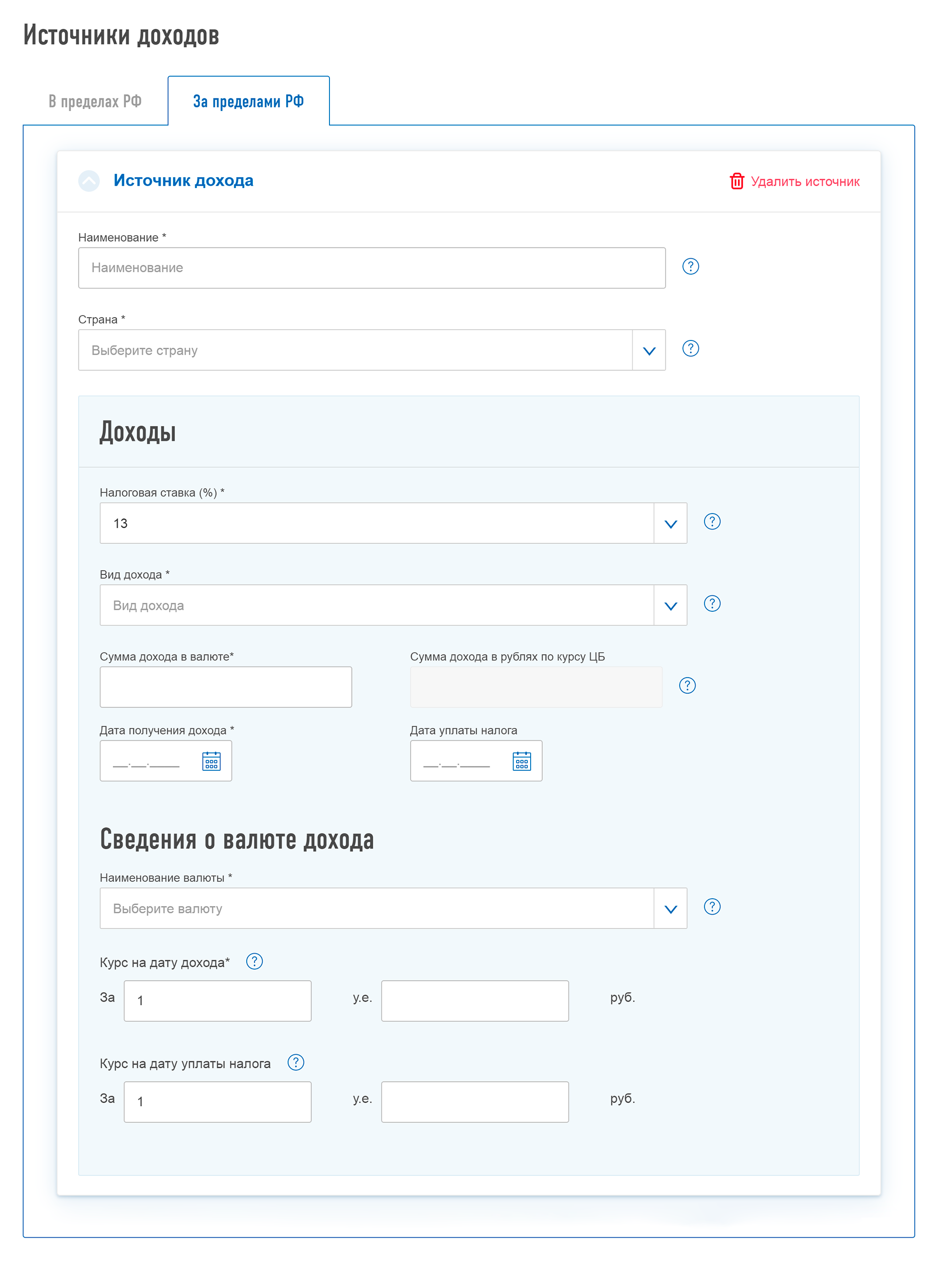 В разделе «Доходы от источников за пределами Российской Федерации» реквизиты не требуются — только наименование источника дохода и страну. Зато просят выбрать вид дохода. Ставьте коды 3010 для букмекеров, 3011 — для лотерей и казино, 2730 — для рекламных акций и 2750 — для других конкурсов и соревнований