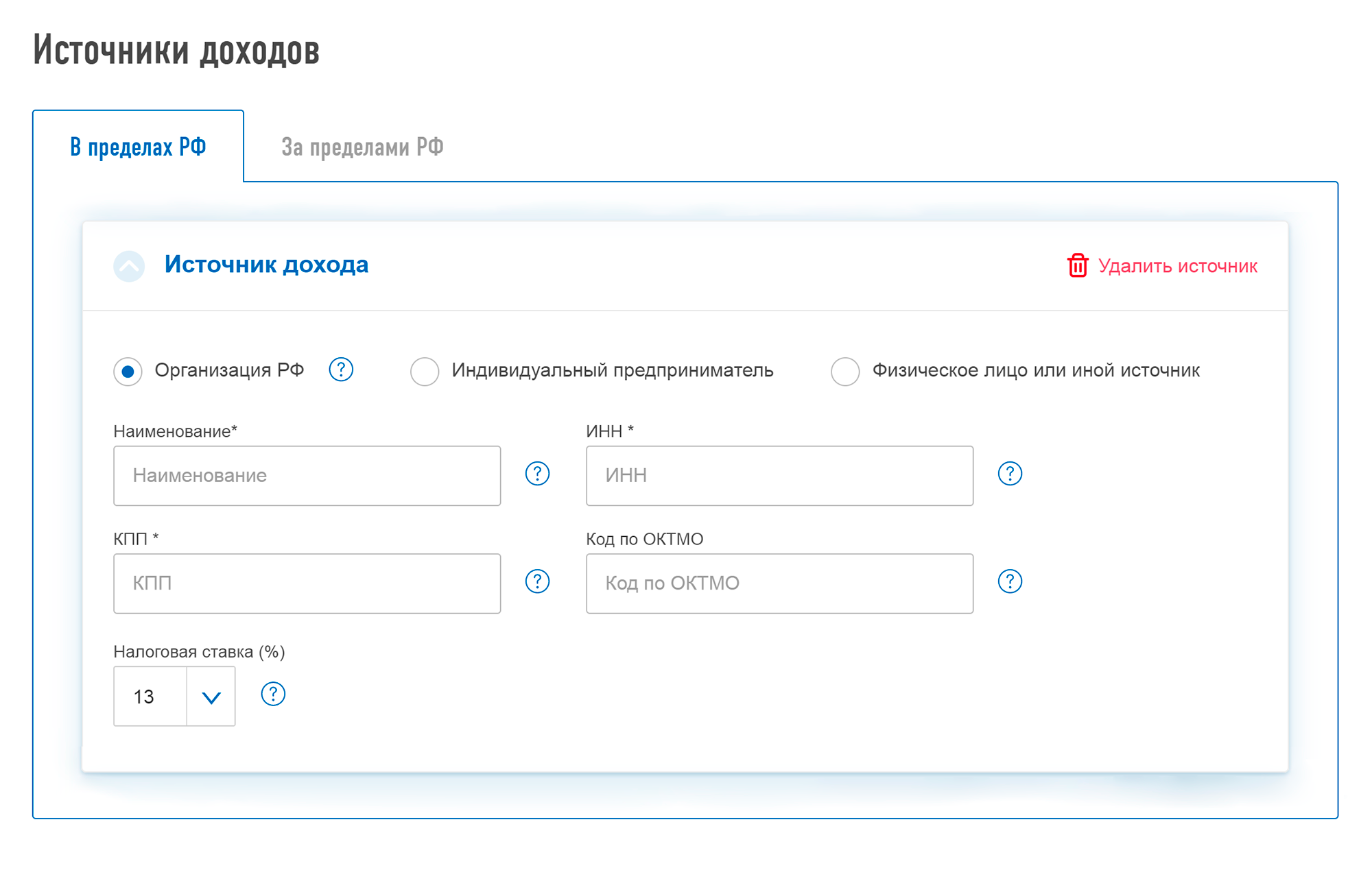 Раздел «Доходы от источников в РФ» частично заполните данными из справок 2-НДФЛ, которые предоставили налоговые агенты. Далее нужно указать источник дохода. По возможности заполните все реквизиты или как минимум название фирмы или ФИО предпринимателя. Если затрудняетесь это сделать, допускается вместо источника вписать вид операции, от которой получен доход. Так и пишите: «выигрыши в лотереи» или «выигрыши в азартные игры»