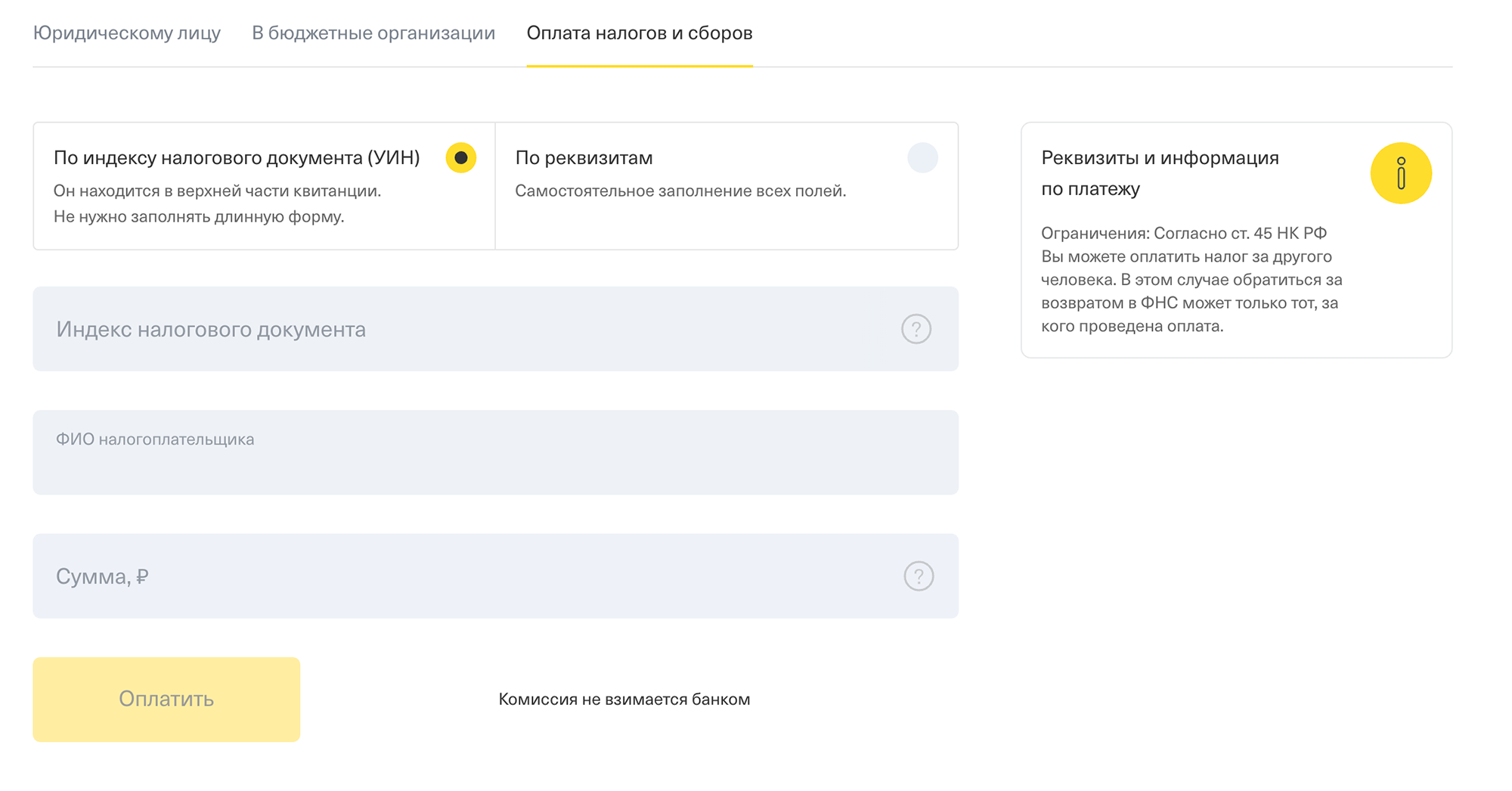 Чтобы оплатить квитанцию по НДФЛ через Тинькофф-банк, зайдите в интернет-банк, перейдите на вкладку «Платежи», найдите там раздел «Переводы» и щелкните по кнопке «Организациям». Там выберите вкладку «Оплата налогов и сборов»