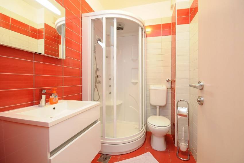 Она может быть маленькой, совмещенной, с душевой кабиной, в оранжевом цвете, в стиле прованс, отделана деревом.
