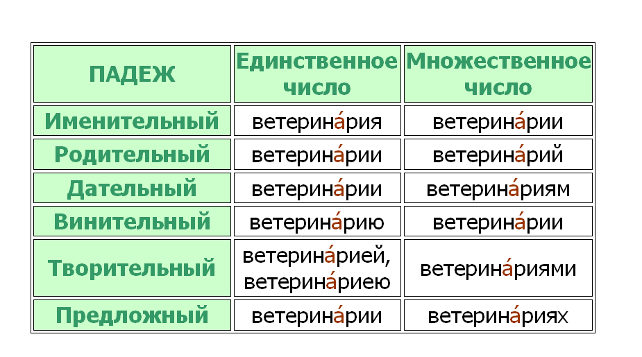 При склонении слова «ветеринария» ударной неизменно будет оставатьсявсе та же гласная «А»: