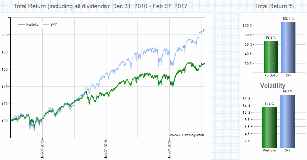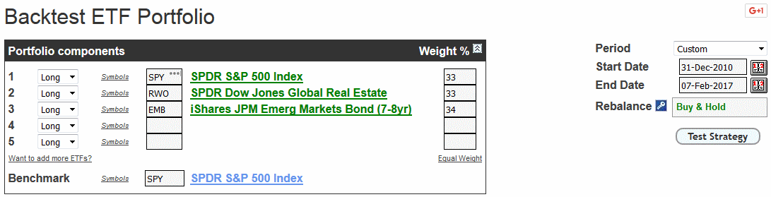 У сайта есть интересная опция «Tools», где можно сравнивать волатильность данных, корреляцию различных фондов между собой и пр. Но наиболее интересно, пожалуй, меню Backtesting — ETF Portfolio с возможность расчета портфеля, включающего в себя до 5 ETF (для подписчиков доступно до 25 биржевых фондов — но увы, подписка стоит 35 долларов в месяц):