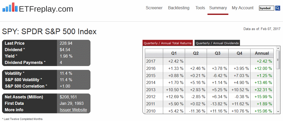 Для примера возьмем фонд SPY из предыдущего примера. Получаем таблицу, где можно увидеть доходность фонда с 1994 года: