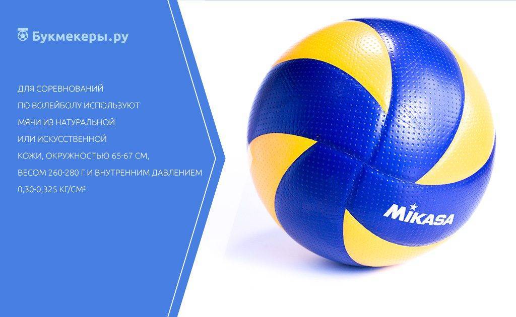 Для соревнований по волейболу используют мячи из натуральной или искусственной кожи, окружностью 65-67 см, весом 260-280 г и внутренним давлением 0,30-0,325 кг/см²