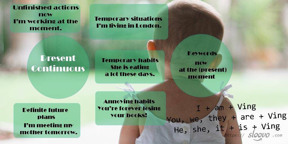 Время Present Continuous Tense (или Present Progressive Tense) — это настоящее длительное время. Данное время употребляется в тех случаях, когда речь идёт о таком действии, которое длится на протяжении какого-то времени в конкретный момент речи. Здесь есть свои «слова-подсказки», которые могут помочь нам понять, что в подобной ситуации (в этом предложении) используется именно это время: now (сейчас), at the (present) moment (в данный (настоящий) момент). Ср., I am reading a book now. (Я сейчас читаю книгу.) Сама ситуация диалога также может стать хорошей подсказкой данного времени: «Hello! What are you doing?» — «Hello! I am reading a book.» («Привет! Что делаешь?» — «Привет! Читаю книгу».)