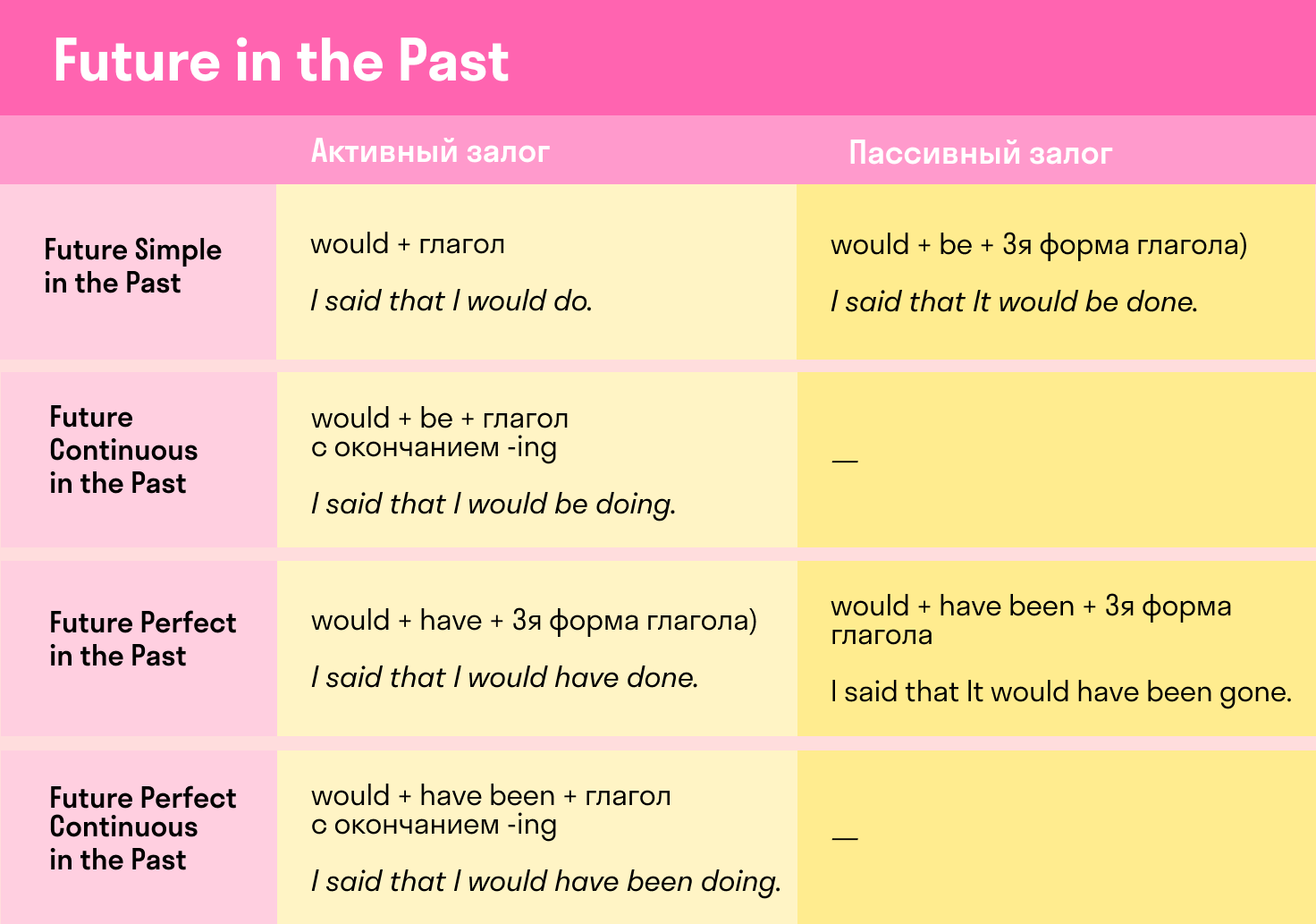 В русском языке такого времени нет. Но если начать думать по-другому, то можно сказать, что у нас есть что-то похожее на такую форму. Например: Он сказал, что придет. «Придет» в русском языке — это глагол будущего времени, а «сказал» — это глагол прошлого времени. Получается, что в нашем языке все-таки присутствует такое понятие как будущее в прошедшем, различие в том, что в нашем языке нет вспомогательного глагола would, который показывает, что действие было в прошлом.