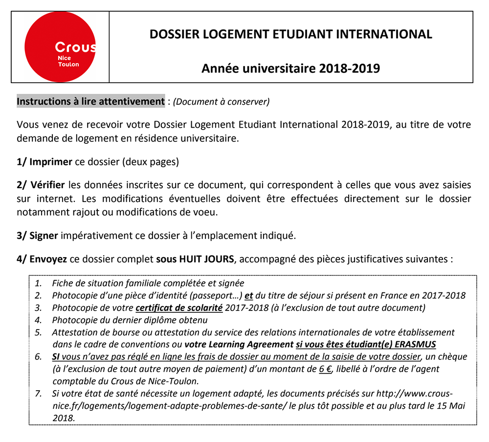 Это один из документов, который мне пришел в ответ на заявку в CROUS. Все эти бланки нужно было распечатать, приложить копии моих документов и отправить почтой