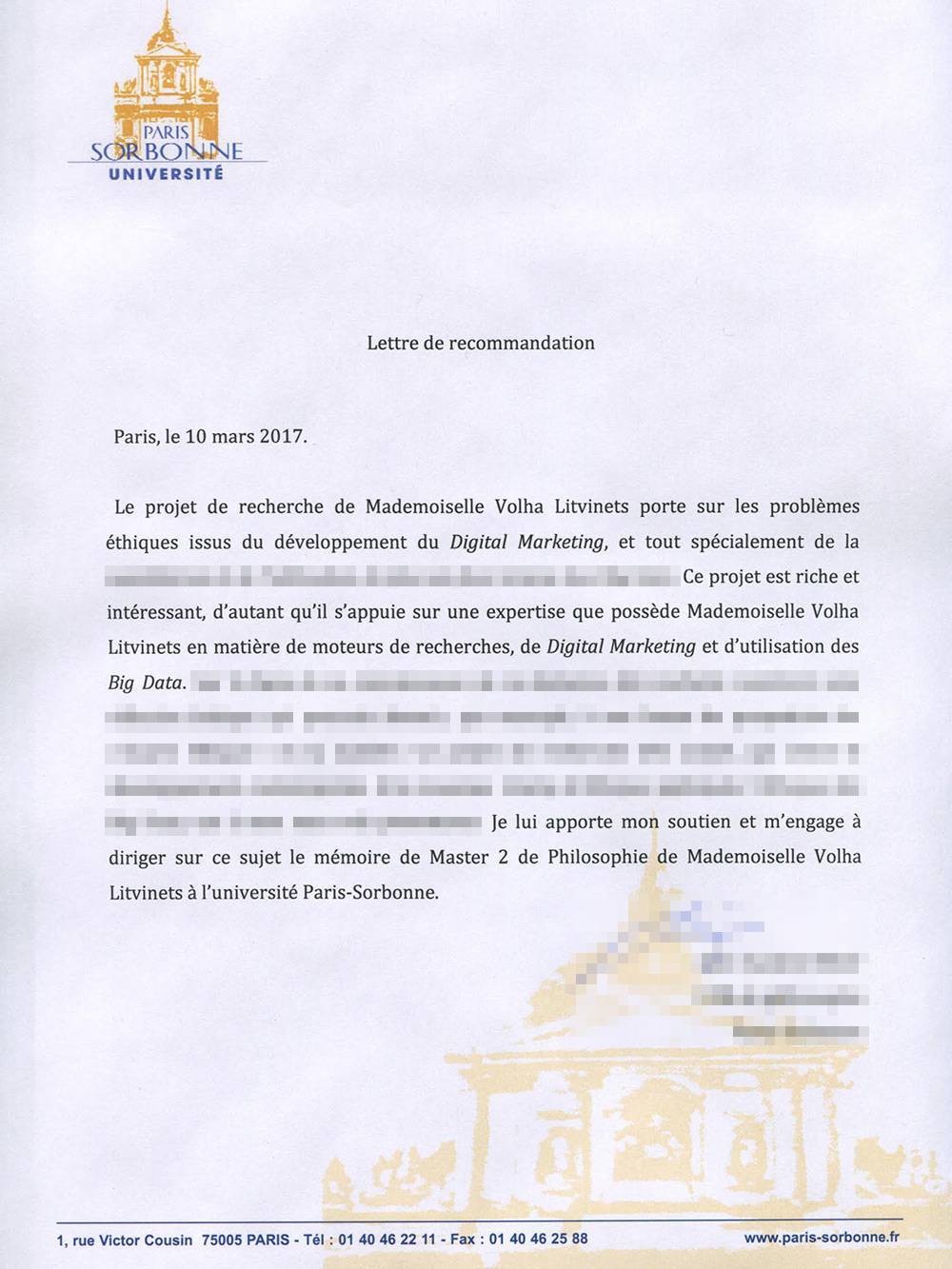 Эту рекомендацию прислал мне профессор Сорбонны, когда я показала ему описание своего проекта. Профессор ответил, что проект богатый и интересный и что он готов поддержать мою кандидатуру и руководить моими исследованиями в магистратуре. Само описание проекта показать не могу, простите