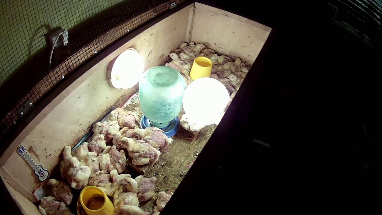Птенцов нужно переместить в коробку, высотой не более 60 см. На дно следует постелить плотную бумагу или ткань без ворса. Затем их переносят в брудер. Это ящик с деревянными стенками, сеткой вместо крышки и лампой (60-100 Вт) для поддержания нужной температуры. Можно использовать инфракрасную лампу.