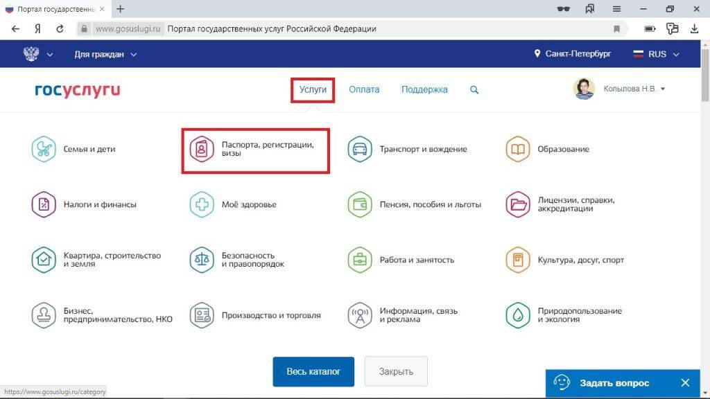 Выберите «Услуги», а затем в выпадающем списке — «Паспорта, визы, регистрации».