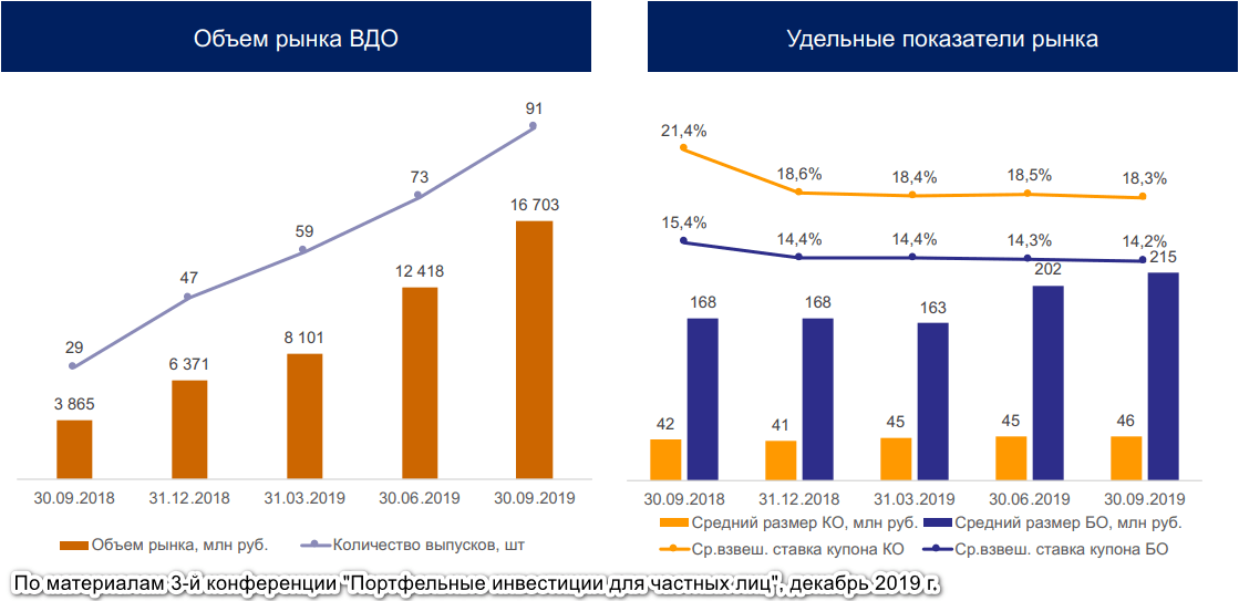 Объем рынка в разрезе биржевых и коммерческих ВДО виден на диаграммах: