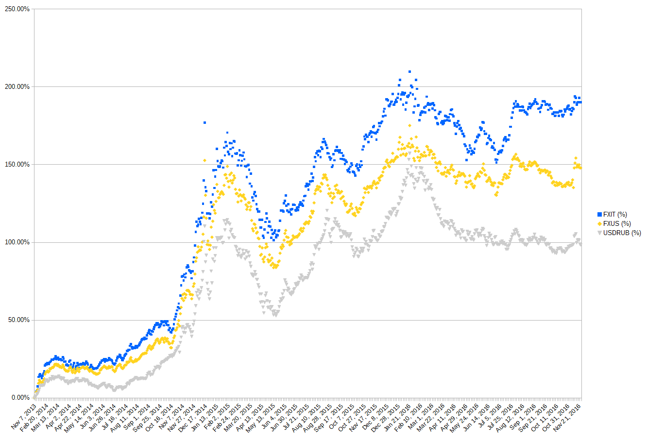 Изменение рублевой цены акций FXIT и FXUS в процентах, изменение курса доллара в процентах