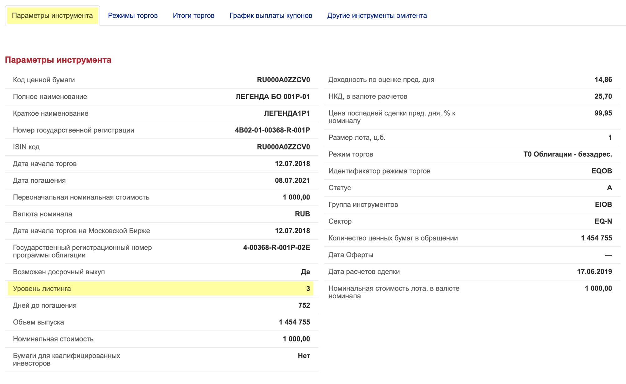 Текущая доходность облигаций «Легенды» на сайте Московской биржи