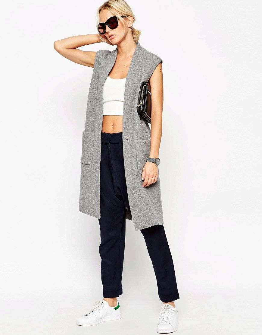 Жилетка одинаково хорошо смотрится с брюками, юбками и джинсами разных фасонов. К длине при этом нет никаких требований, главное — ориентироваться на особенности своей фигуры.