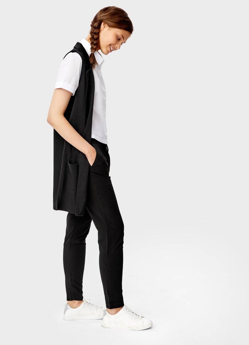 Особую популярность обрели черные жилетки, т.к. они лучше всего подходят для деловых образов и их легко сочетать с другой одеждой. Их можно комбинировать как с базовыми цветами, так и с яркими, а также смело надевать вниз рубашку или футболку с узорами и принтами.