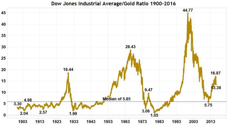 Отношение выше показывает, сколько золота требовалось для приобретения одной акции Dow Jones. С одной стороны мы видим, что на пиках фондовых максимумов (1929, 1964 и 1999 годы) это отношение последовательно брало новые высоты, тогда как кризисы соответствуют дешевому рынку с минимальным значением вплоть до единицы. Следующий виток может быть достигнут как ростом фондового рынка, так и падением цены на золото — или же тем и другим одновременно. Но с другой стороны уровень 2009 года был и в 1920-х, и в 1950-х годах. Относительно среднего значения американский рынок на сегодня выглядит к золоту хотя и переоцененным, но скорее на умеренную величину.